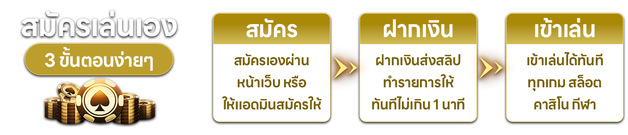 ตอบ : - เข้าเว็บไซต์ กดปุ่มสมัครสมาชิก กรอกข้อมูลส่วนตัว เบอร์โทร บัญชีธนาคาร รอรับ username/password ภายใน 3 นาที เริ่มเดิมพันได้ทันที